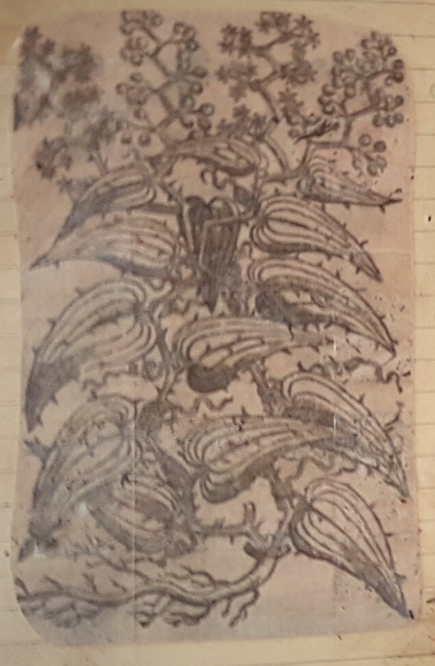 Next to a woodcut of a fearsome looking creeper, our gardener adds some equally gruesome common names for the plant: ‘snarlweed, wightbind, drag-below, slough maker, strangler’s friend’